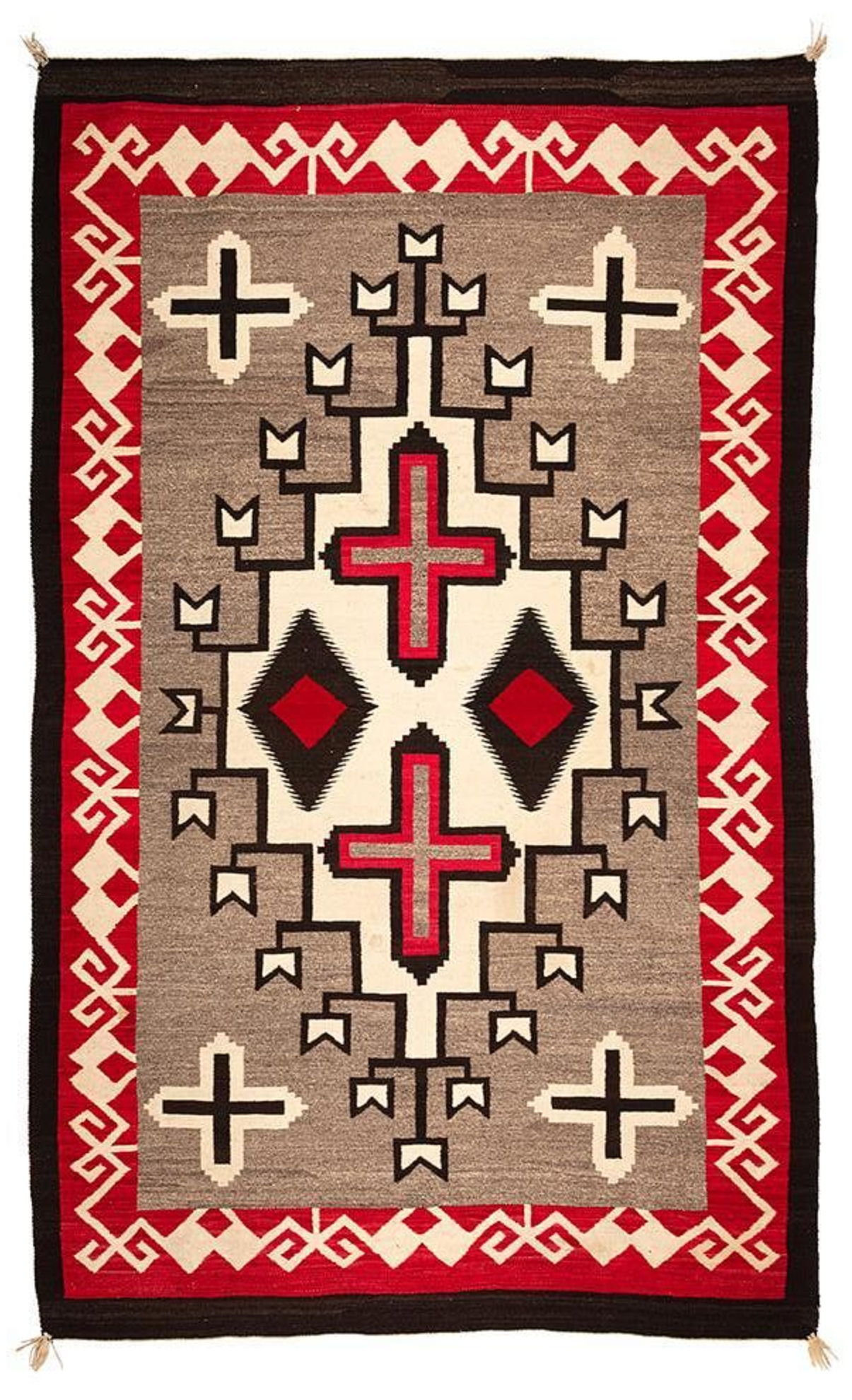 Superb Crystal Rug featuring bold diamonds and crosses on a grey field surrounded by an elaborate red, black and white border. Woven from all Navajo Churro handspun, hand-carded and hand-dyed long-staple wools on a wool warp. Date: ca. 1930. Dimensions: 8'4" x 5'2"; 254 × 157.48 cm. Auctioned in 2024; March in Montana, Coeur d’Alene Galleries and The Coeur d'Alene Art Auction.
