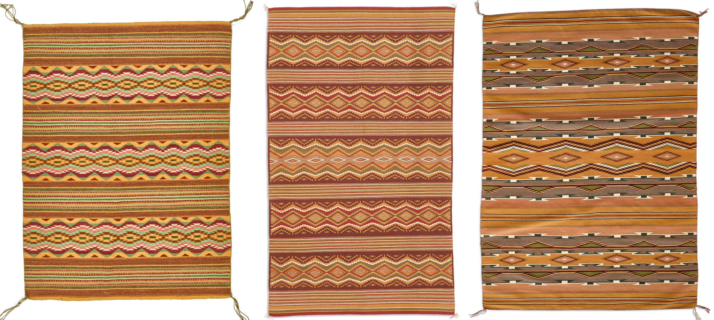 CENTER: Chinle Rug, 1950-60. Dimensions: 67.5 × 43 in.; 171.45 × 109.22 cm. Sold at auction in 2024 by Mark Sublette. Medicine Man Gallery & Auction Tucson, Arizona.